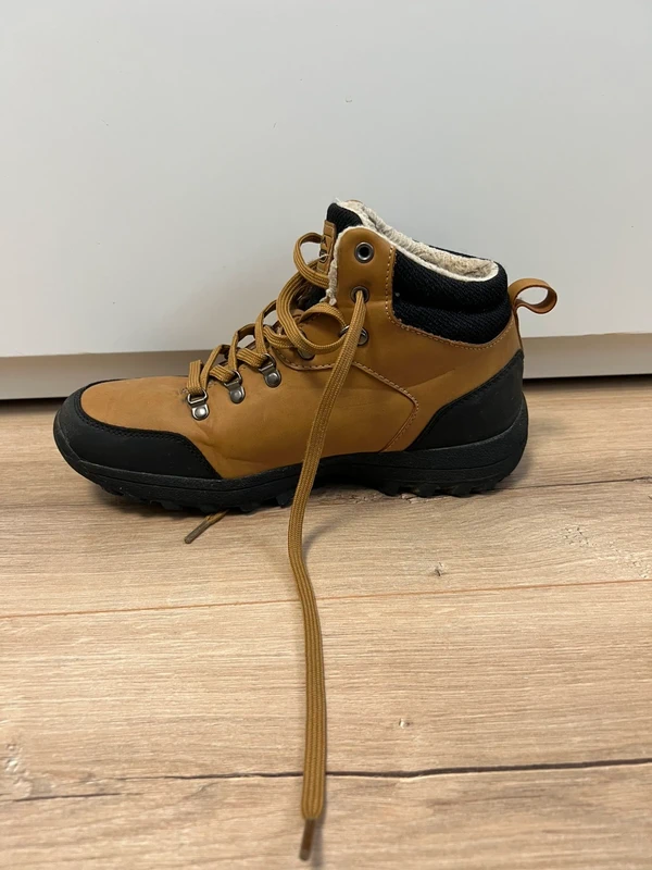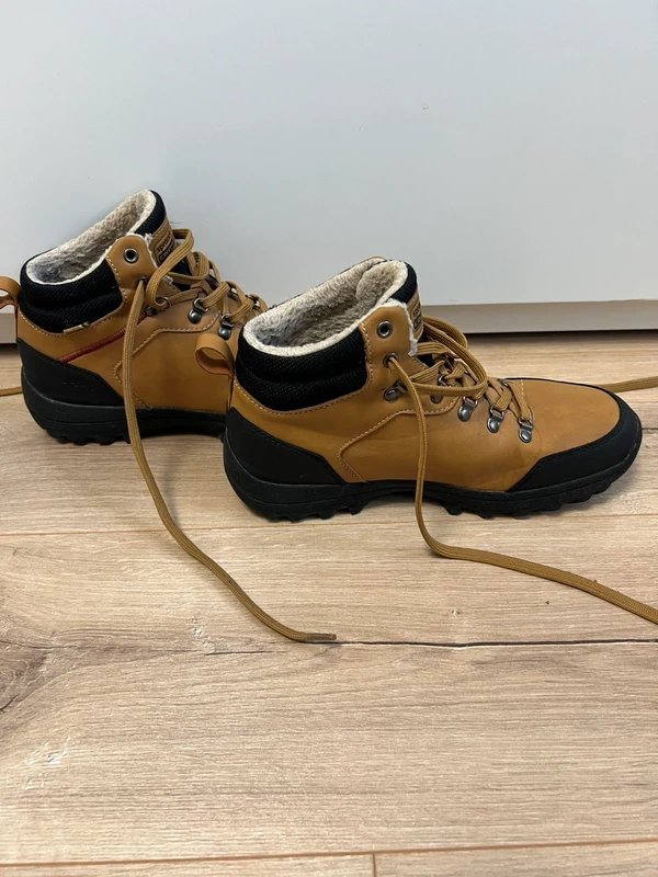 Brązowe męskie buty , rozmiar 39. Wysoka cholewka dobrze trzyma kostkę.. Gruba, gumowa podeszwa z bieżnikiem daje dobrą przyczepność na różnych nawierzchniach, buty sprawdzą się na co dzień . Stan używany – noszone, ale zadbane, z normalnymi śladami użytkowania widocznymi na zdjęciach, bez uszkodzeń wpływających na wygodę chodzenia.